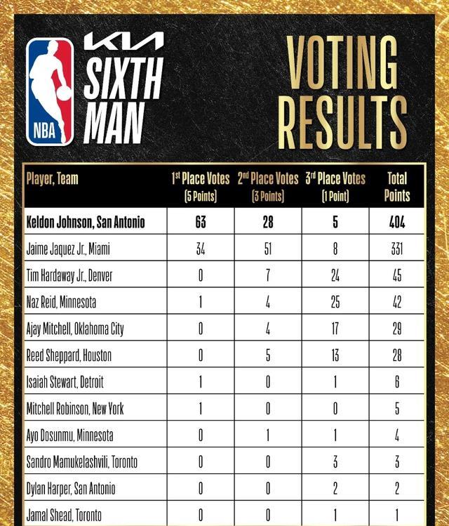 哈克斯拿到34张第一选票,51张第二选票和8张第三选票,总得分331分跟凯尔登差距并不算大。小哈达威只拿到7张第二选票,以及24张第三选票,总得分45分。森林狼里德拿到42分,雷霆阿杰伊-米切尔29分,火箭谢泼德28分。